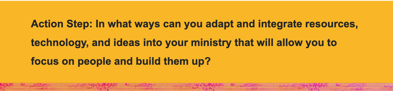 These are some examples of how, to connect with people rather than reinvent the wheel, we use existing resources to be more agile as a team, develop other areas, and focus on what really matters: loving God and loving people.